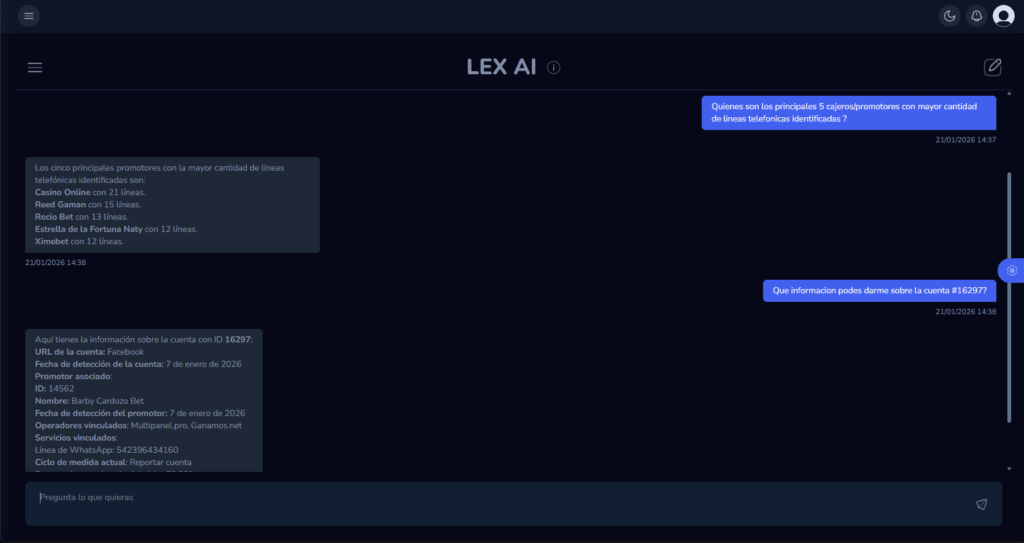 Lex AI reduce el costo de acceder a información crítica cuando el sistema ya acumula cientos de miles de registros y relaciones. En lugar de depender de perfiles técnicos para armar consultas, cruces o reportes, cualquier equipo puede formular preguntas en lenguaje natural y obtener respuestas con contexto. Esto acelera análisis, mejora coordinación y evita pérdidas de tiempo en búsquedas manuales o interpretaciones incompletas. El foco es transformar datos complejos en decisiones rápidas, justificables y consistentes.